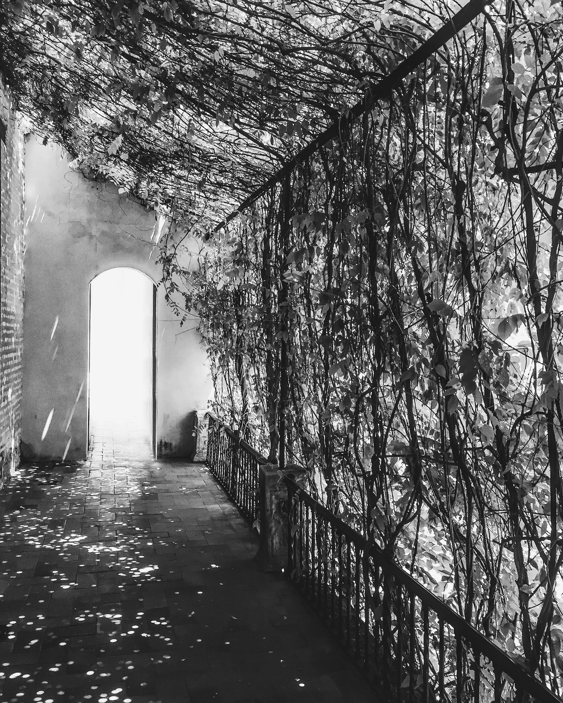 Blur the lines between inside and out. I stumbled on this paradise strolling through the Royal Alcázar in Seville, a space in-between, dappled sunshine pouring through an ivy screen. What stories have these walls seen? • Mike Brown © 2015 • Apple iPhone 6 • ISO 32 4.15mm f/2.2 1/30 sec.